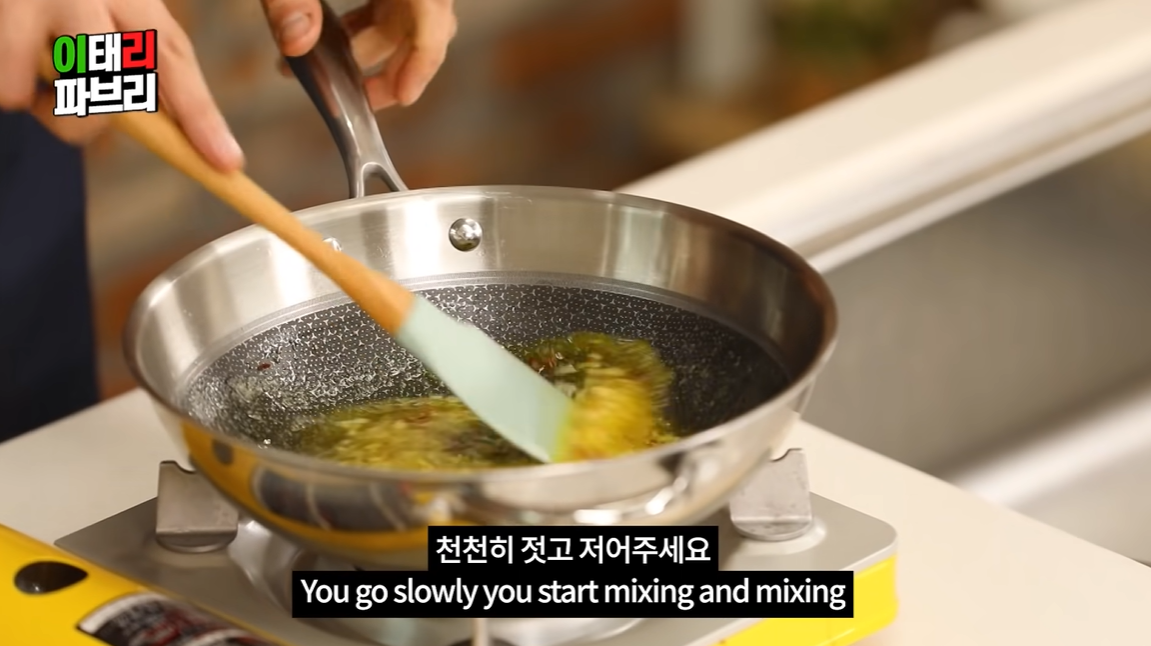 약불에 마늘과 오일을 올린다.