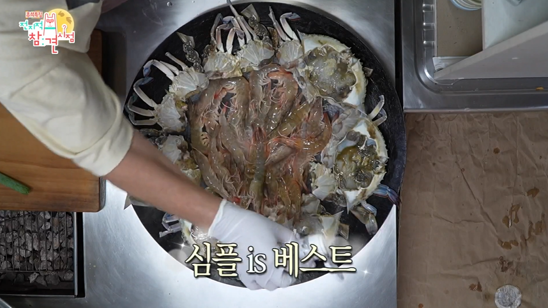 다음은 솥뚜껑에 꽃게 새우 찌우며 굽기