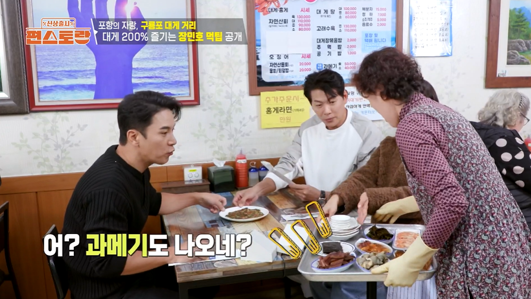편스토랑 306회에서는 장민호, 김용필, 김양이 포항 구룡포 대게 거리에 가 한 대게집에서 식사를 했는데요.
