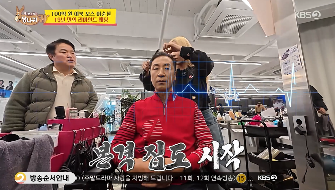 순실의 남편 황 이사는 먼저 샵에서 메이크업을 받고 장 이사를 따라 탈모계의 이국종이라는 헤어 디자이너 샵에 갔는데요.